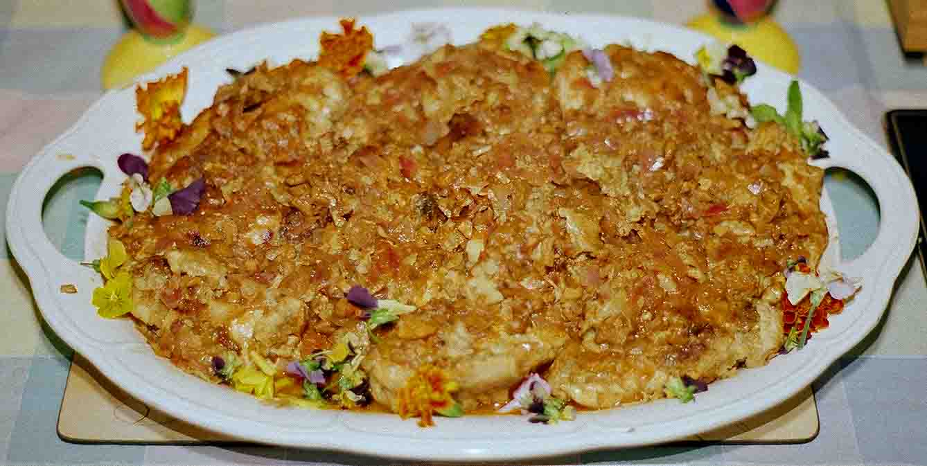 In a large bowl, mix the flour, thyme, salt, and pepper. In a separate bowl, beat the eggs lightly (just to break up the yolks). Dip each chicken breast in the eggs, then cover with the flour mixture.